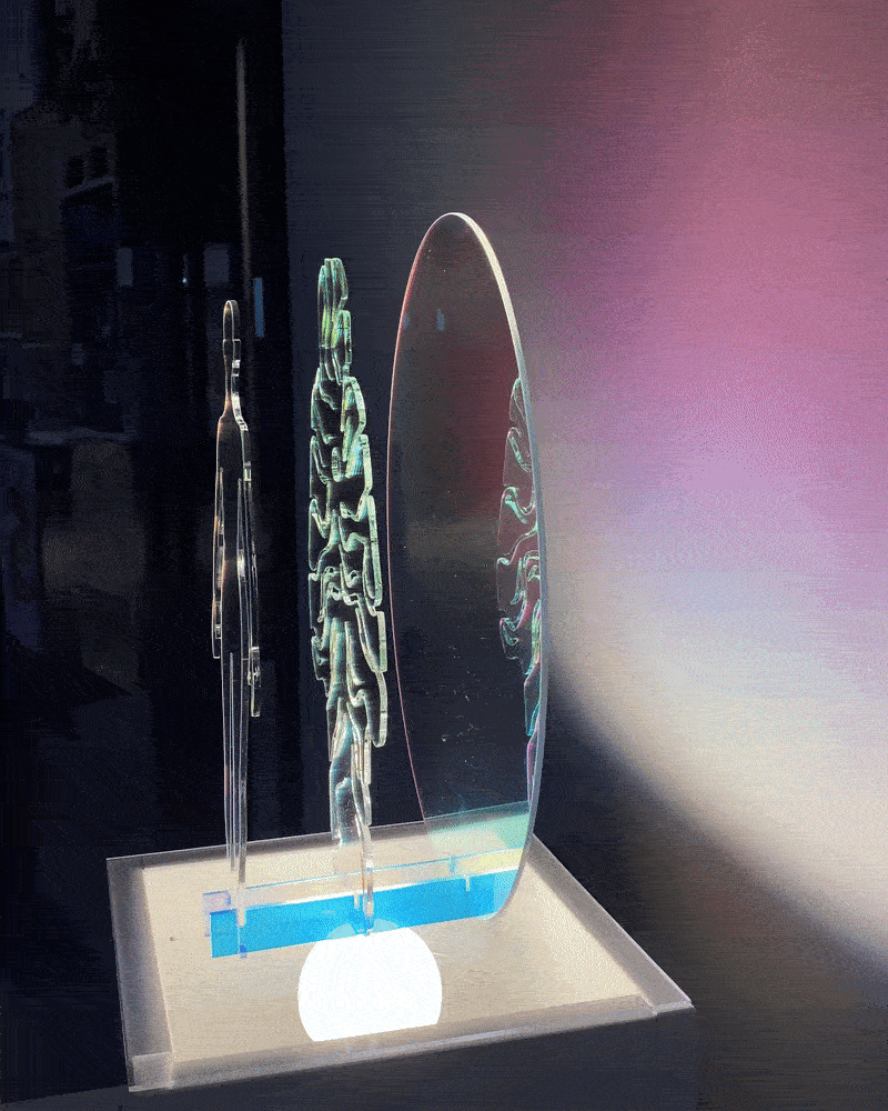 This light artwork reveals how I perceive the world as a synesthete, seeing people through a spectrum of colors. Made from iridescent plexiglass, it explores how light and reflection can capture the individuality and glowing color surrounding each person.